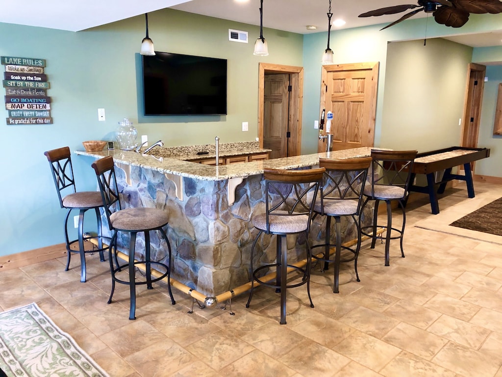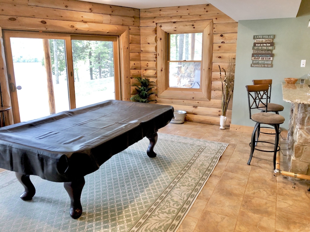 - The game room is designed for friendly competition, featuring a full bar, pool table, shuffleboard, and a large collection of board games and puzzles for all ages.