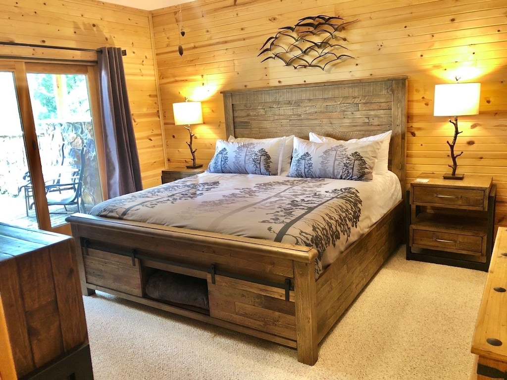 - Cozy lower‑level bunk room featuring a custom twin‑over‑double log bunk bed for a rustic hideaway.