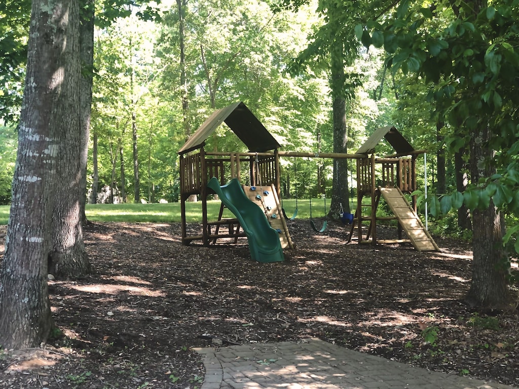 - Outdoor living spaces include multiple decks and patios with comfortable seating, an outdoor fireplace, a firepit by the private beach, a playground, and hammocks.
