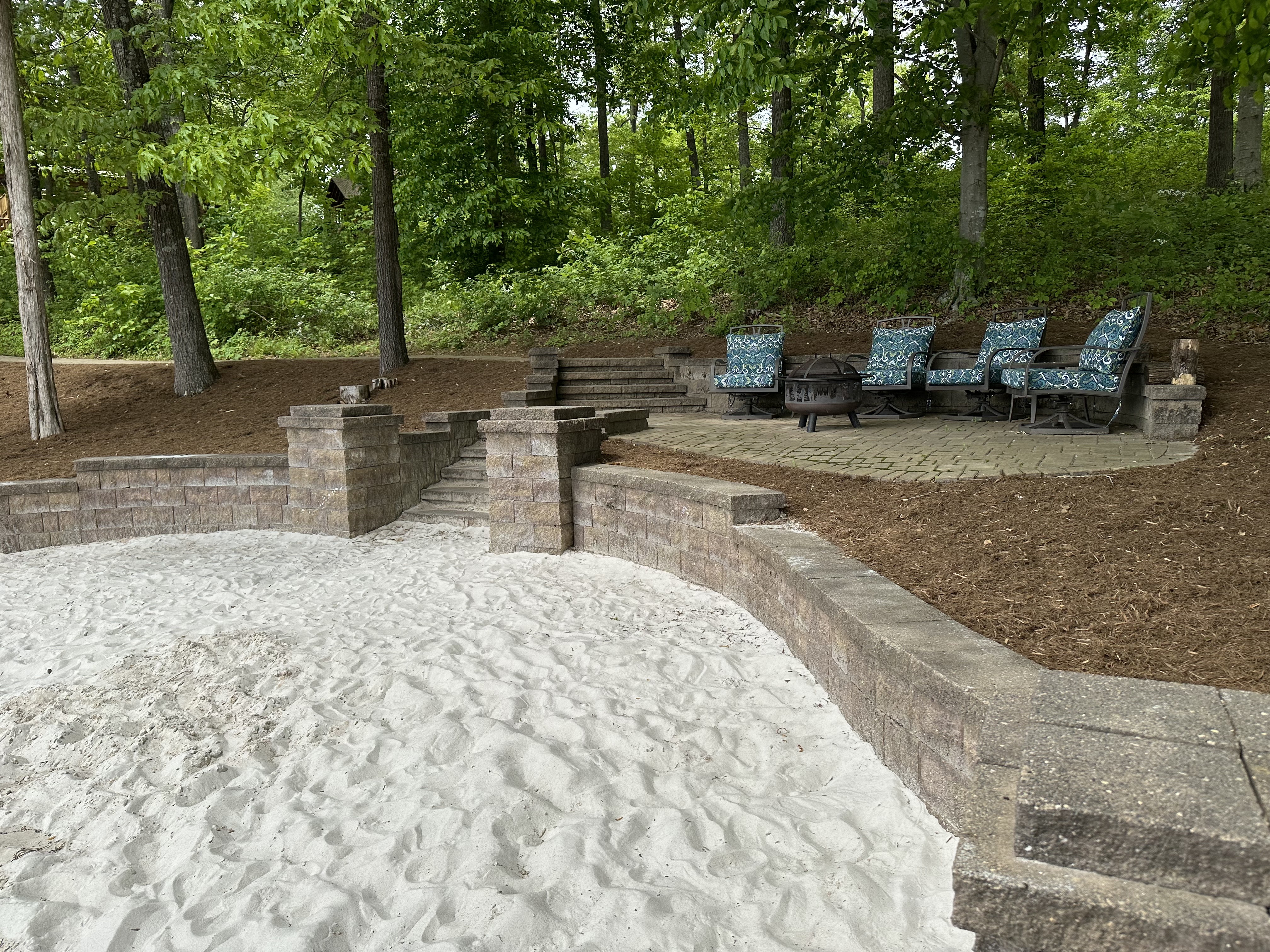 - A private beach and lakeside patio firepit create the perfect gathering spot, complete with Adirondack chairs and cushioned seating for relaxing by the water.