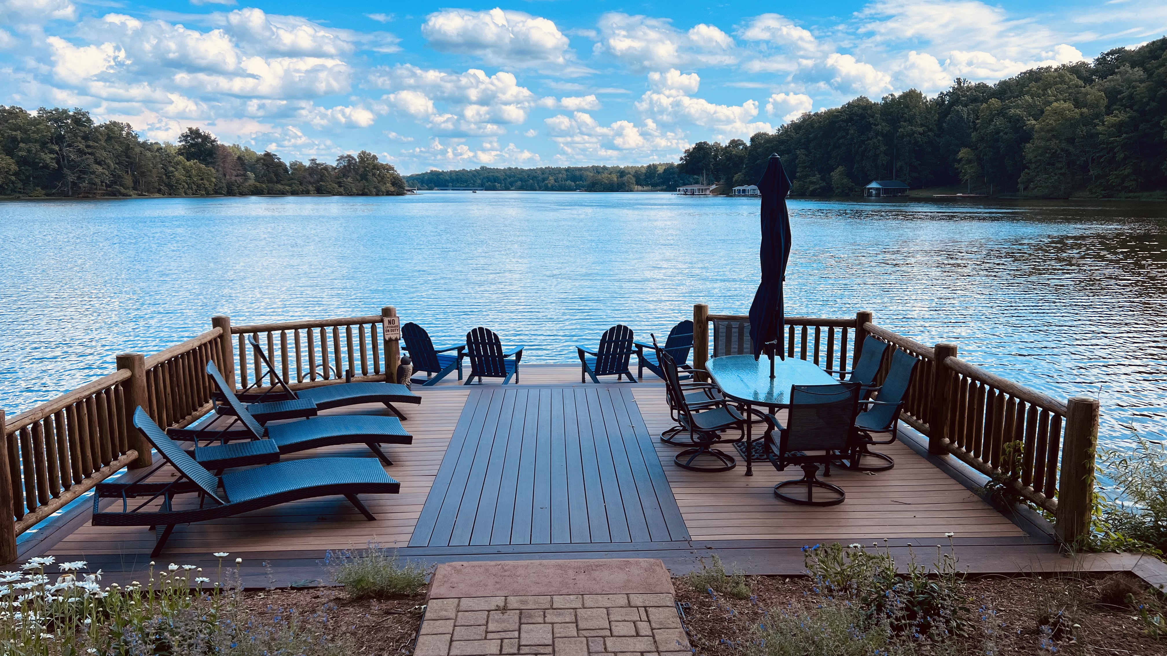 - The multi‑level water deck sits right at the shoreline, offering space to jump in for a swim, sunbathe on lounge chairs, or enjoy meals at the waterfront dining table.